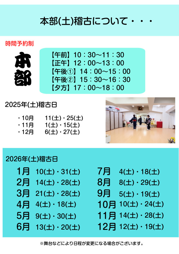 只今、「稽古時間」「(土)稽古開始」「問い合わせ」「子供年齢5歳未満要相談」